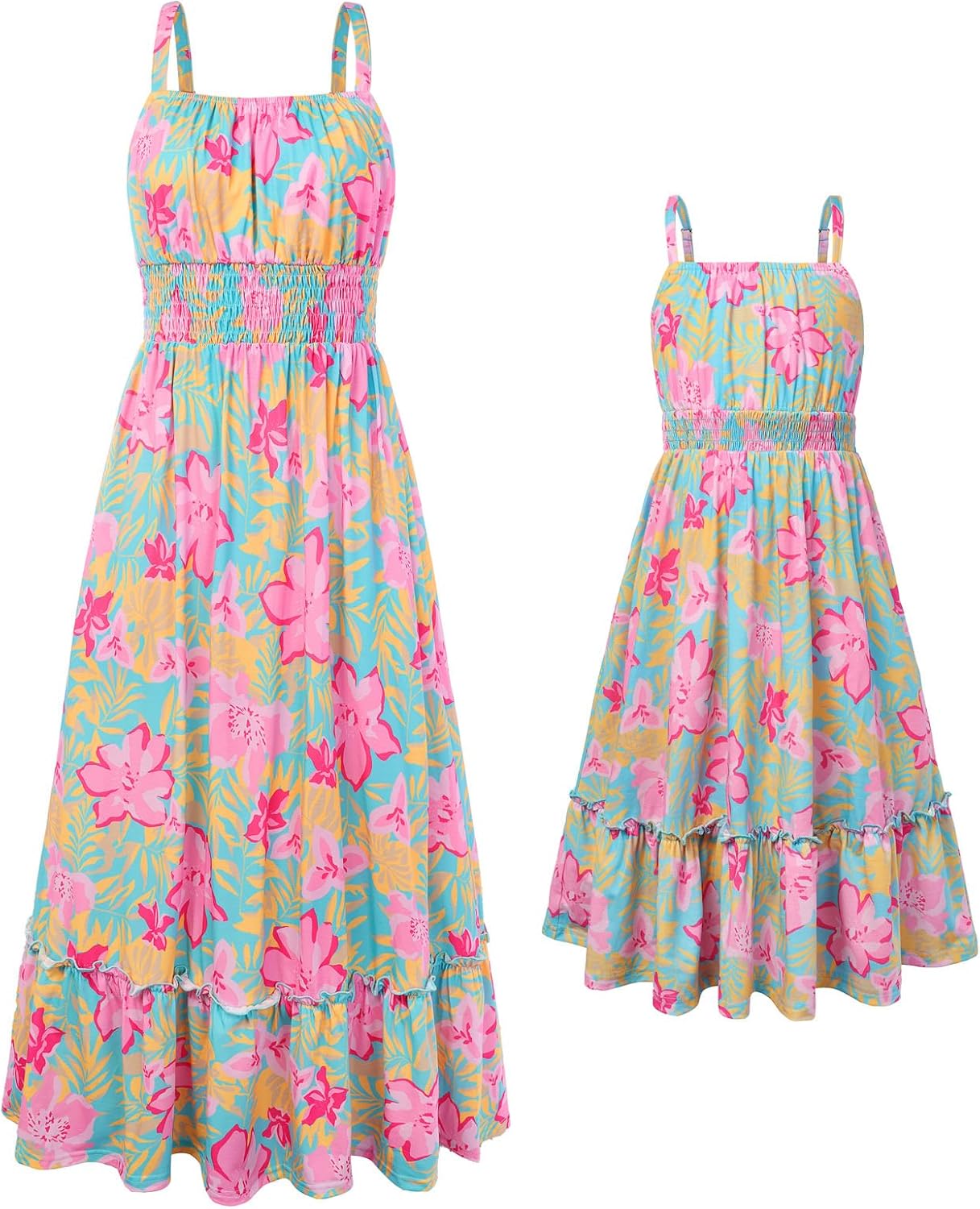 Matching Family Outfits: Floral Ruched Sundresses — Bohemian-Style Summer Maxi Dresses (With Pockets)