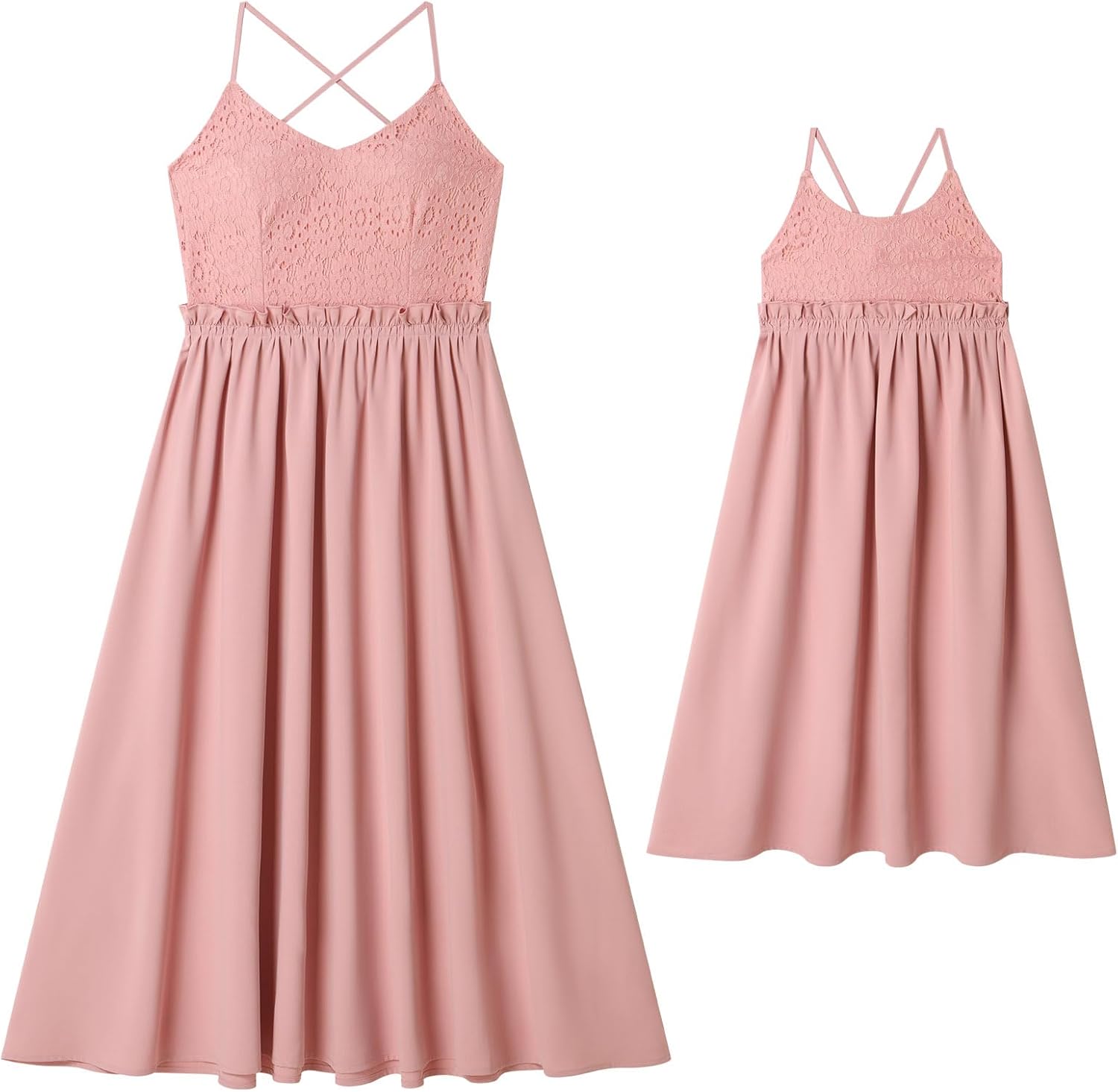 - Mother Daughter Matching Boho Dress: women girls matching lace boho dress summer casual beach holiday sundress, elegant v-neck or round neck, delicate lace floral bodice, pullover style dress with sweet ruffles decor at elastic waist, adjustable spaghetti strap cross back backless slip dress, provides best fit for you and your daughter, beautiful and chic mommy and daughter boho dress to wear.